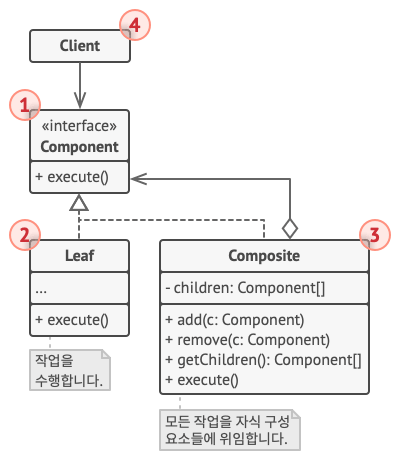 3. Composite는 Component 인터페이스를 구현하며, 여러 Leaf를 실제로 호출하는 역할을 수행합니다.