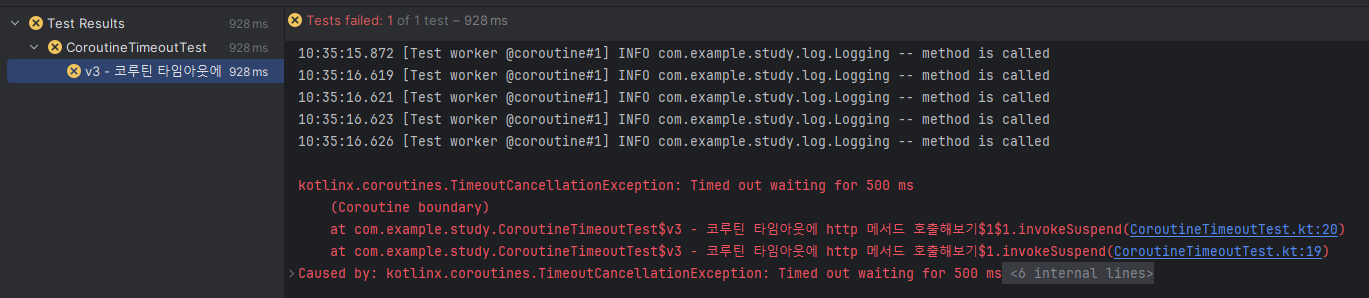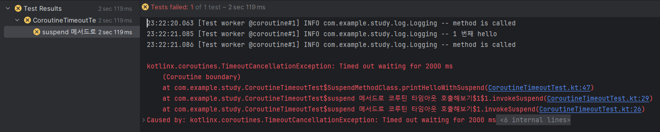 2번째의 메서드가 실행되다가 TimeoutCancellationException이 발생하게 됩니다.