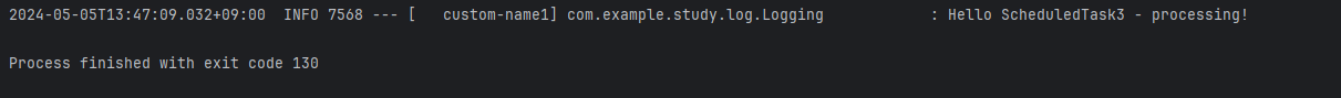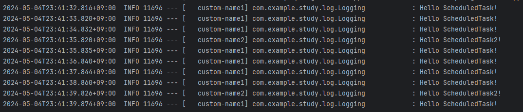 스레드 이름으로 정의한 custom-name이 출력되며 2개의 스케쥴링 작업이 독립적으로 잘 수행되는 것을 확인할 수 있습니다.