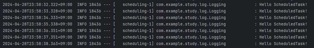 @Component class ScheduledTask { @Scheduled(fixedDelay = 1000) fun run(){ logger.info { "Hello ScheduledTask!" } } }이후에는 @Scheduled 어노테이션을 활용하여 1초 간격으로 작업을 수행해 보는 예제를 작성해 보았습니다.