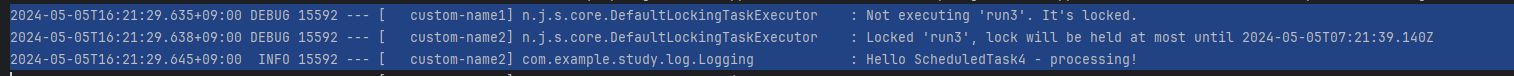 @Scheduled(fixedDelay = 1000 * 11) @SchedulerLock(name = "run3", lockAtLeastFor = "PT10S", lockAtMostFor = "PT10S") fun run3(){ LockAssert.assertLocked(); logger.info { "Hello ScheduledTask3 - processing!" } val result = RestTemplate().getForEntity<String>("http://httpbin.org/delay/10") logger.info { "Hello ScheduledTask3 - done!" } } @Scheduled(fixedDelay = 1000* 11) @SchedulerLock(name = "run3", lockAtLeastFor = "PT10S", lockAtMostFor = "PT10S") fun run4(){ LockAssert.assertLocked(); logger.info { "Hello ScheduledTask4 - processing!" } val result = RestTemplate().getForEntity<String>("http://httpbin.org/delay/10") logger.info { "Hello ScheduledTask4 - done!" } }@SchedulerLock의 name을 run3()로 동일하게 두면 2개의 메서드 중 하나만 실행됩니다.