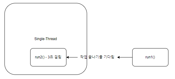 즉, single-thread에서 동작하기 때문에 run2()에서 작업이 오래 걸리는 경우 run1() 작업은 blocking 되어 실행되지 못하는 상태가 돼버립니다.