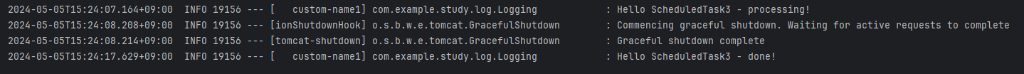 @Scheduled(fixedDelay = 1000) fun run3(){ logger.info { "Hello ScheduledTask3 - processing!" } val result = RestTemplate().getForEntity<String>("http://httpbin.org/delay/10") logger.info { "Hello ScheduledTask3 - done!" } }예를 들어 10초가 걸리는 스케쥴링작업이 구동되고 애플리케이션에 SIGTERM 요청을 받아 종료된다고 가정해 보겠습니다.