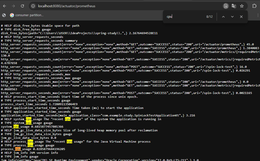 management: endpoints: web: exposure: include: "*"이후 서버를 구동하고 http://localhost:8080/actuator/prometheus 로 접근하면 cpu에 대한 지표를 확인해 볼 수 있습니다.