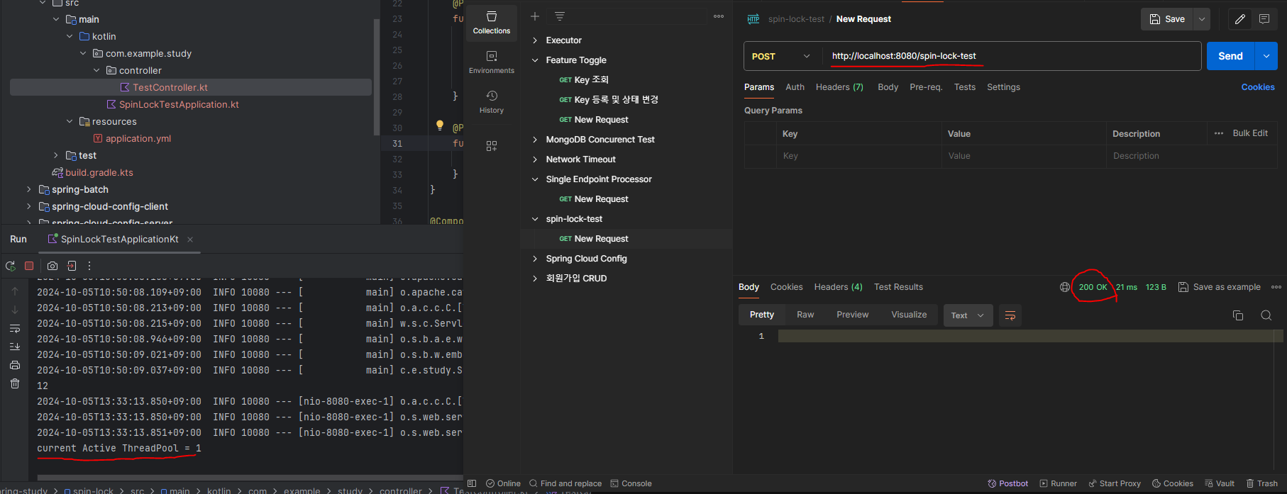 postman을 활용하여 /spin-lock/test 로 호출해 보니 current Active ThreadPool은 1개로 나오며 내부적으로 while문이 돌아가고 있게 됩니다.
