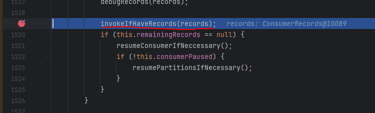 spring-kafka가 consume 하는 로직에 디버깅포인트를 찍고 들어가 보겠습니다.