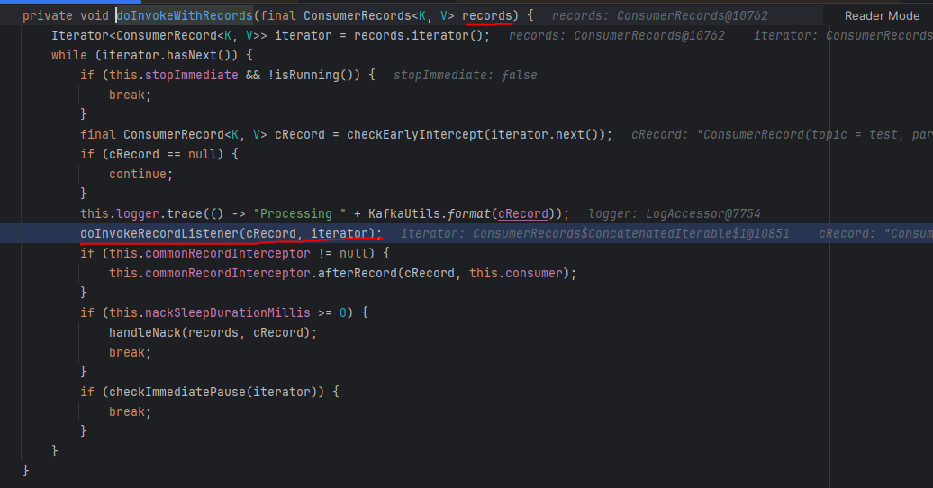 반복문을 통하여 메시지 처리 doInvokeWithRecords 메서드에서 반복문을 통하여 doInvokeRecordListener를 호출합니다.