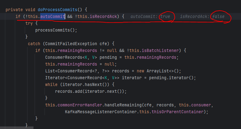 doProcessCommits 메서드 autoCommit이 false이며 recordAck가 false인 경우에는 processCommits() 메서드를 수행합니다.