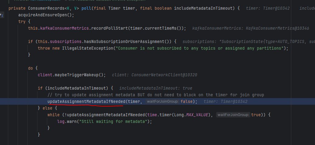 poll() 메서드 내부에서 updateAssignmentMetadataIfNeeded 호출 kafkaConsumer의 poll 메서드 내부에는 updateAssignmentMetadataIfNeeded()를 호출하고 있습니다.