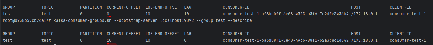 test라는 이름을 가진 consumer group의 current-offset을 살펴보면 2초마다 2개씩 offset이 commit 되지 않고 한 번에 10개의 commit이 반영된 것을 확인할 수 있습니다.