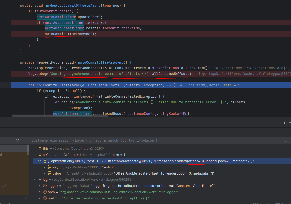 autoCommitOffsetsAsync에서 offset을 10으로 commit autoCommitOffsetAsnyc() 메서드를 살펴보면 실제 commit이 일어나고 test-0 토픽에 offset을 10으로 세팅하는 모습을 볼 수 있습니다.