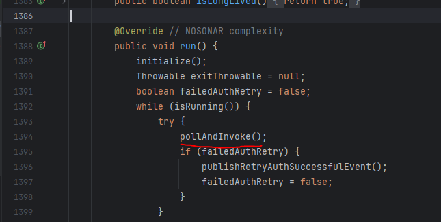 run 메서드 KafkaMessageListenerContainer의 run() 메서드에서 pollAndInvoke() 메서드를 호출합니다.