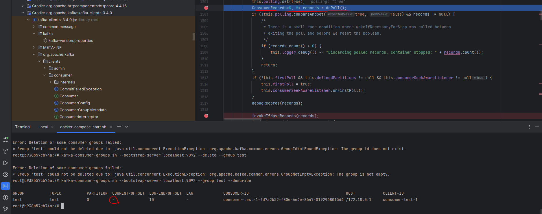 메시지가 처리되었지만 current-offset은 반영되지 않음 10개의 메시지가 모두 처리된 후 다시 메시지를 가져오기 위해 doPoll() 메서드를 호출합니다.