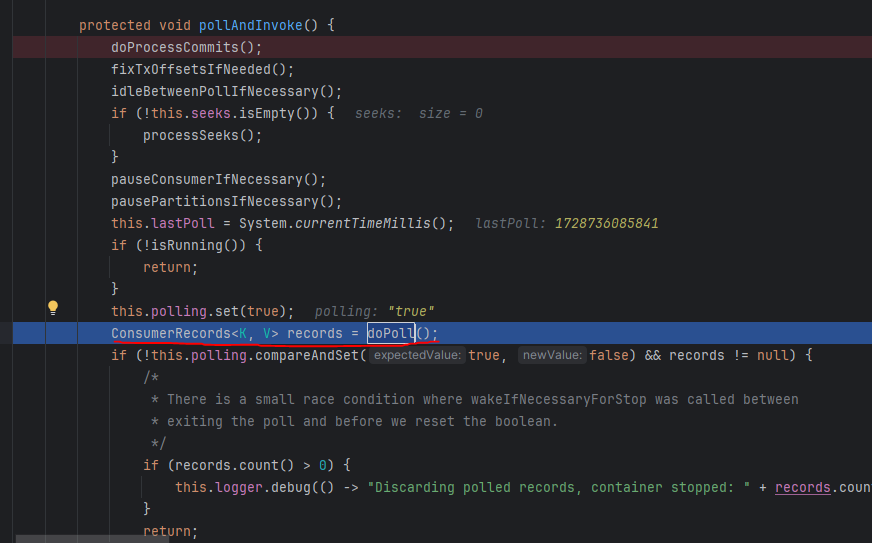 doPoll() 호출으로 메시지를 가져온다. doProcessCommits에서는 조건에 만족하지 않아 별다른 처리가 일어나지 않았고 아래의 doPoll()을 호출합니다.