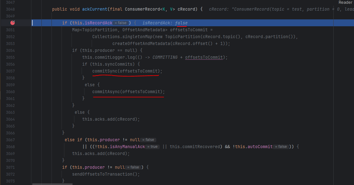 record 형식이라면 commit 하지만 record 방식의 commit이 아니라면 commitSync(), commitAsync() 메서드는 호출되지 않습니다.
