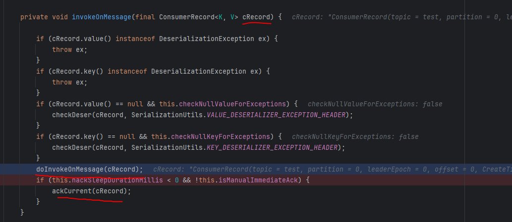 개별 메시지 처리이후 ackCurrent 메서드 호출 이후에는 invokeOnMessage 메서드를 통해 개별 메시지의 처리가 doInvokeOnMessage() 메서드에 의해 이루어집니다.