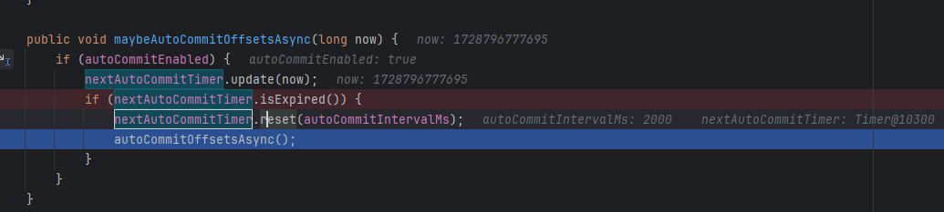 이때 autoCommitIntervalMs가 지났는지 검사하고 시간이 지났다면 reset을 통해 새롭게 다음에 일어날 autoCommit 시간을 세팅합니다.