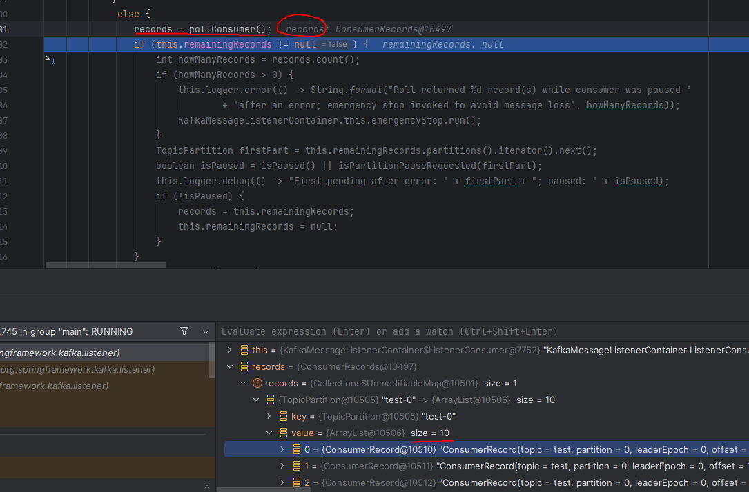 디버깅에 size = 10 확인 pollConsumer() 메서드를 통해 10개의 records를 가져옵니다.