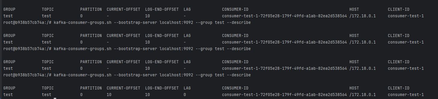 kafka-consumer-groups.sh --bootstrap-server localhost:9092 --group test --describetest라는 이름을 가진 consumer group의 offset을 확인해 볼 수 있습니다.