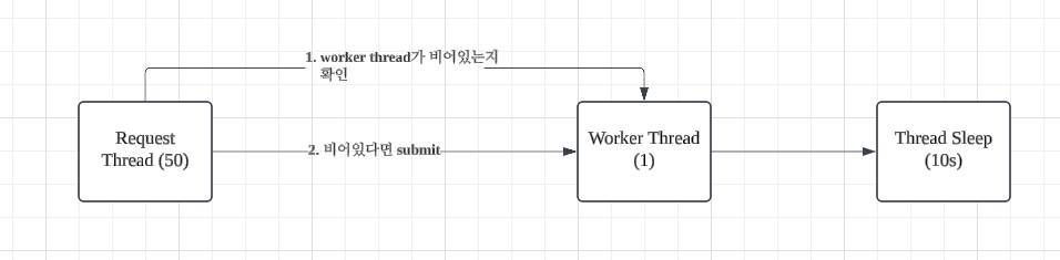 50개의 Request Thread가 Worker Thread 라는 임계영역으로 들어가기 위해 worker thread의 activeCount가 1개 미만인지 지속적으로 spin-waiting 방식으로 체크합니다.