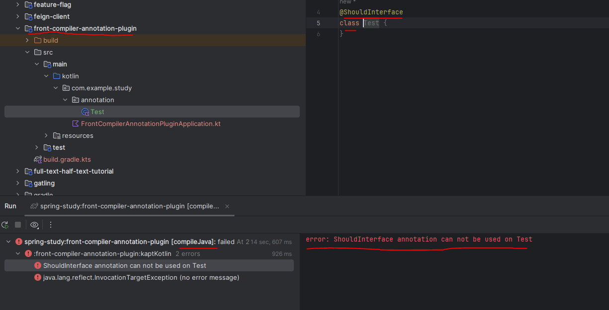 세 번째로 front-compiler-annotation-plugin 모듈을 구성하고 @ShouldInterface 어노테이션에 class를 활용하여 컴파일을 돌리면 아래 사진처럼 실패하는 모습을 볼 수 있습니다.