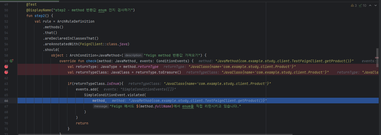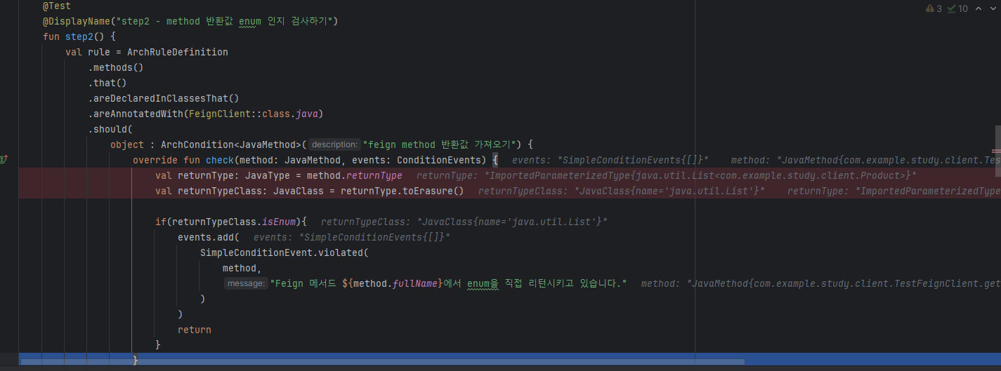 @Test @DisplayName("step2 - method 반환값 enum 인지 검사하기") fun step2() { val rule = ArchRuleDefinition .methods() .that() .areDeclaredInClassesThat() .areAnnotatedWith(FeignClient::class.java) .should( object : ArchCondition<JavaMethod>("feign method 반환값 가져오기") { override fun check(method: JavaMethod, events: ConditionEvents) { val returnType: JavaType = method.returnType val returnTypeClass: JavaClass = returnType.toErasure() if(returnTypeClass.isEnum){ events.add( SimpleConditionEvent.violated( method, "Feign 메서드 ${method.fullName}에서 enum을 직접 리턴시키고 있습니다." ) ) return } } } ) rule.check(importedClasses) }JavaType의 메서드인 toErasure() 메서드를 호출하면 JavaType 타입이 JavaClass로 타입이 변환됩니다.