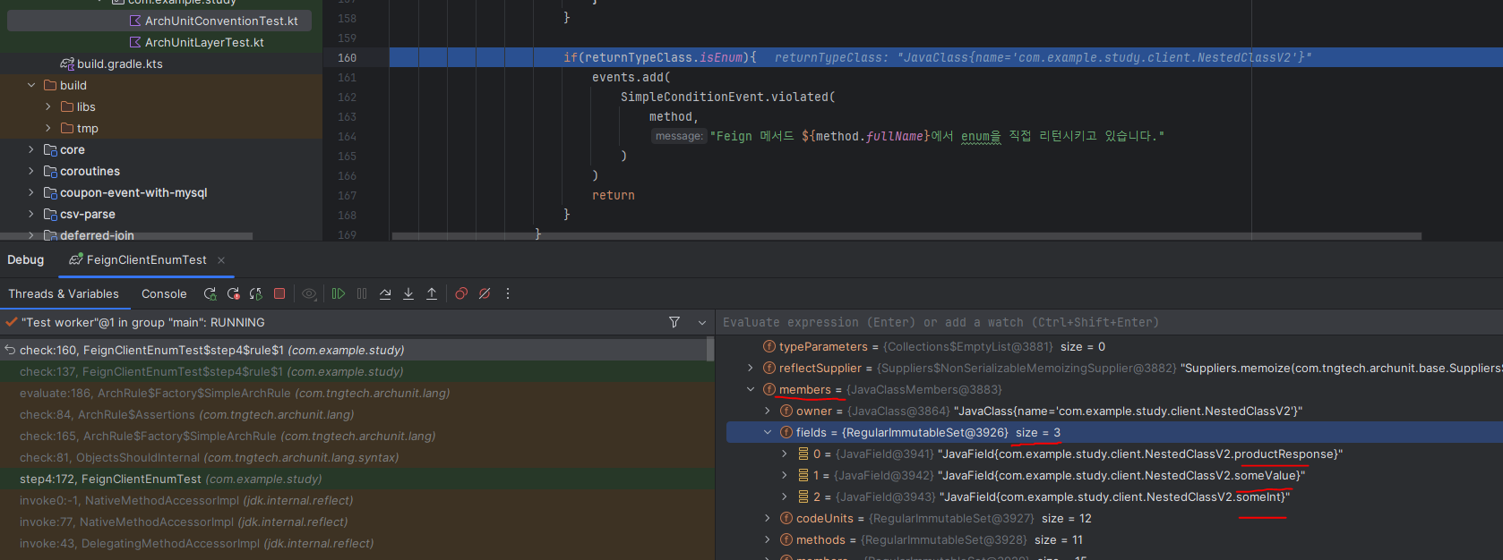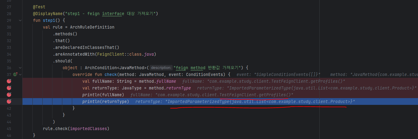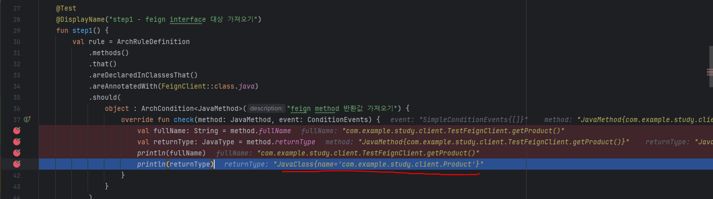 class FeignClientEnumTest { // 테스트할 클래스를 임포트 val importedClasses: JavaClasses = ClassFileImporter() .withImportOption(ImportOption.DoNotIncludeTests()) .importPackages(FeignTestApplication::class.java.packageName) @Test @DisplayName("step1 - feign interface 대상 가져오기") fun step1() { val rule = ArchRuleDefinition .methods() .that() .areDeclaredInClassesThat() .areAnnotatedWith(FeignClient::class.java) .should( object : ArchCondition<JavaMethod>("feign method 반환값 가져오기") { override fun check(method: JavaMethod, event: ConditionEvents) { val fullName: String = method.fullName val returnType: JavaType = method.returnType println(fullName) println(returnType) } } ) rule.check(importedClasses) } }현재의 관심사는 @FeignClient 어노테이션이 붙어있는 모든 클래스의 메서드들의 반환타입을 검사하여 반환타입에 Enum이 포함되는지 검사하는 것입니다.