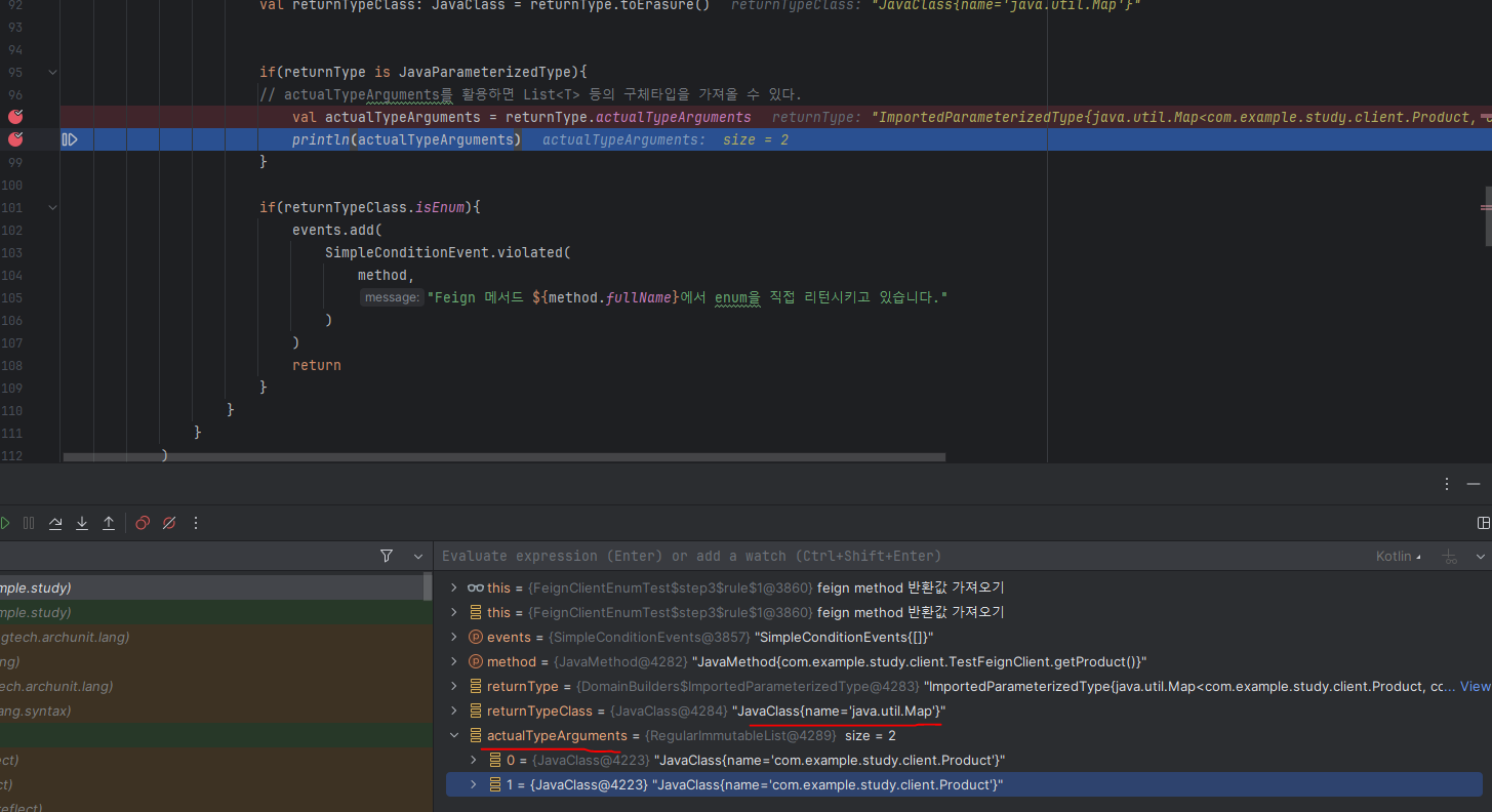 @Test @DisplayName("step4 - Nested Class 검사하기") fun step4() { val rule = ArchRuleDefinition .methods() .that() .areDeclaredInClassesThat() .areAnnotatedWith(FeignClient::class.java) .and() .areNotAnnotatedWith(AllowedClientUsingEnumReturnType::class.java) .should( object : ArchCondition<JavaMethod>("feign method 반환값 가져오기") { override fun check(method: JavaMethod, events: ConditionEvents) { val returnType: JavaType = method.returnType val actualTypes = getActualTypes(returnType) if(isUsingEnum(method = method, actualTypeArguments = actualTypes, events = events)){ return } checkFieldsRecursively(actualTypes, events){ fieldsActualTypes: List<JavaType>, events: ConditionEvents -> if(isUsingEnum(method = method, actualTypeArguments = fieldsActualTypes, events = events)){ return@checkFieldsRecursively true } return@checkFieldsRecursively false } } } ) rule.check(importedClasses) }기존에는 제네릭을 그대로 넘겼기 때문에 검증할 수 없었습니다.