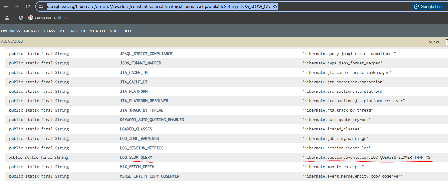 org.hibernate.SQL_SLOW : SlowQuery: 7 milliseconds. SQL: 'HikariProxyPreparedStatement@217590872 wrapping prep0: select t1_0.id,t1_0.name from test_entity t1_0 where t1_0.id=? {1: UUID 'dfba05cf-f216-43db-af10-2c1432da42f6'}'만약 설정이 잘 되지 않는다면 해당 옵션은 AvailableSettings라는 클래스에서 설정되므로 디버깅해 볼 수 있습니다.