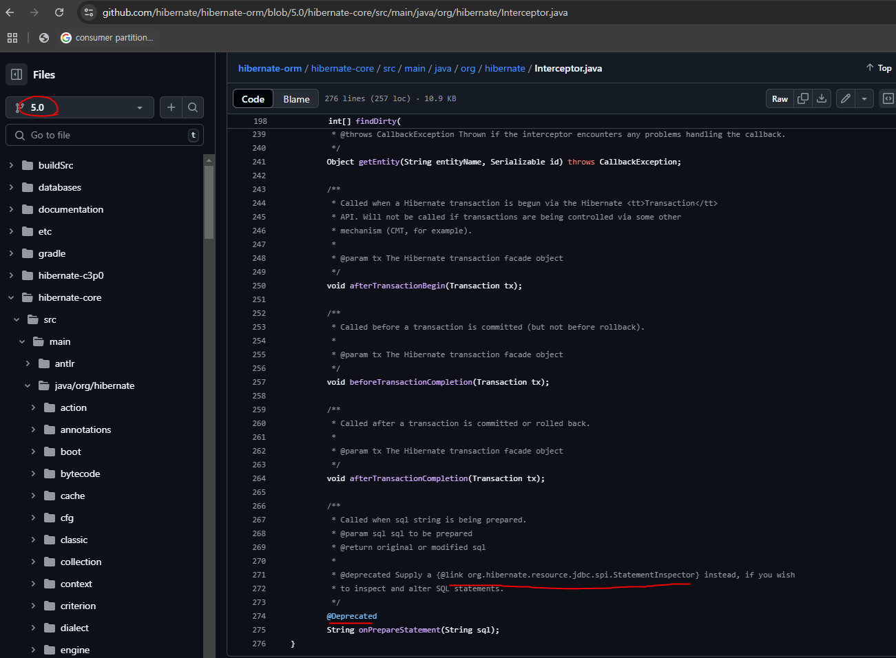하지만 아래 그림과 같이 Hibernate 5.0부터 Interceptor의 onPrepareStatement가 Deprecated되어 StatementInspector를 활용하라고 javaDocs에 명시되어 있습니다.