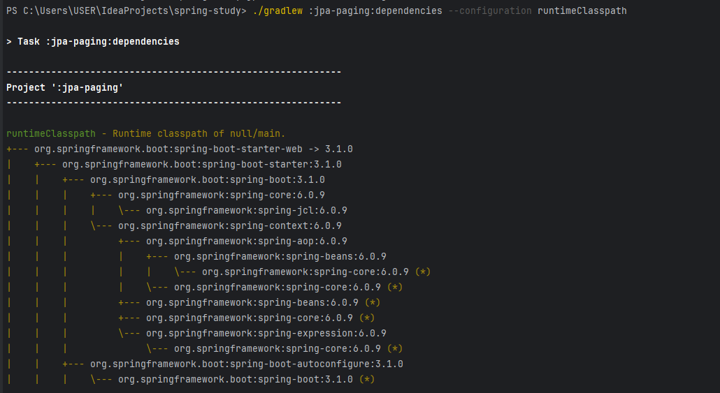 jpa-paging 이라는 서브모듈의 의존성 트리 이를 통해 하위 라이브러리가 어떤 의존성을 가지고 있는지 분석할 수 있습니다.