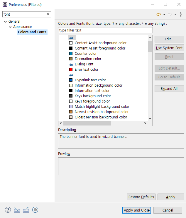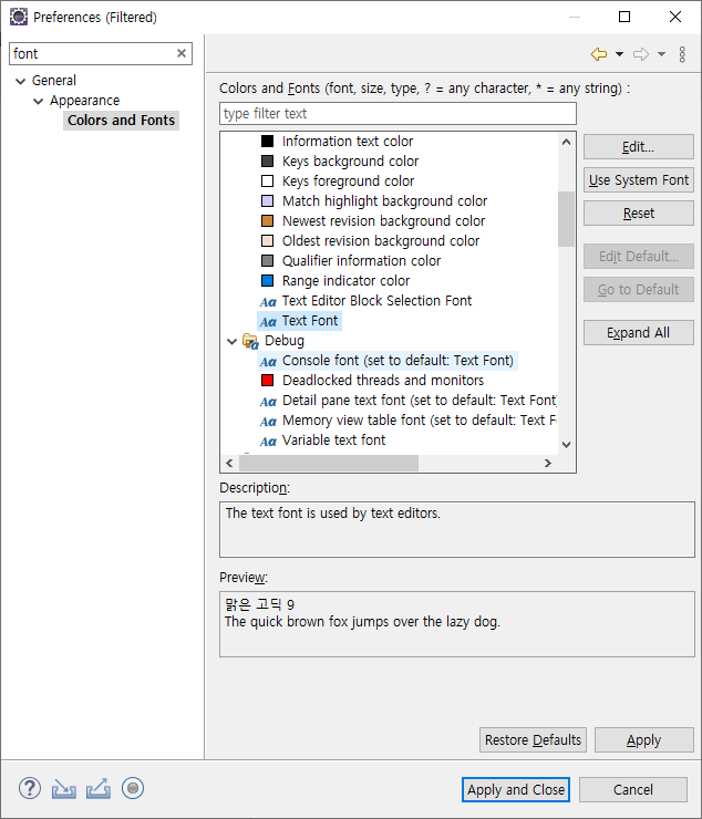 우선 우클릭을 눌러 Preferences로 들어가 우측 상단에 font를 검색하여 Colors and Fonts로 이동합니다.