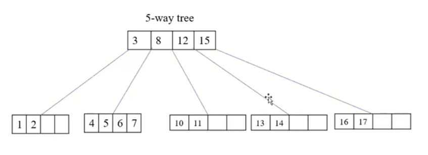 다음 그림은 5차 B-Tree, 5-way tree의 예시입니다.