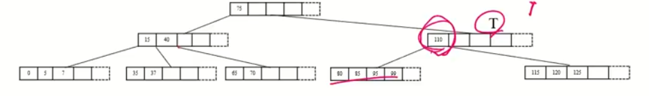 1. 삭제할 k가 포함된 node T를 탐색합니다. (node T는 95, 97, 99 가 될 것입니다)