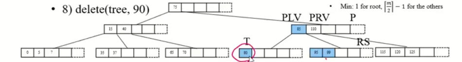 5. RS에서 값을 빌려오게 되면 RS가 MIN_KEY 조건을 위배하기 때문에 빌려올 수 없습니다. 그렇기 때문에 T, PLV, RS를 merge 합니다.