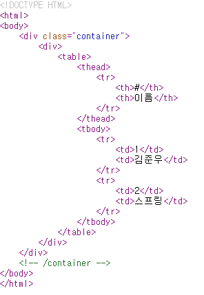 <!DOCTYPE HTML> <html xmlns:th="http://www.thymeleaf.org"> <body> <div class="container"> <div> <table> <thead> <tr> <th>#</th> <th>이름</th> </tr> </thead> <tbody> <tr th:each="member : ${members}"> <td th:text="${member.id}"></td> <td th:text="${member.name}"></td> </tr> </tbody> </table> </div> </div> <!-- /container --> </body> </html>위의 코드는 실제 구동시 다음과 같이 표시됩니다.