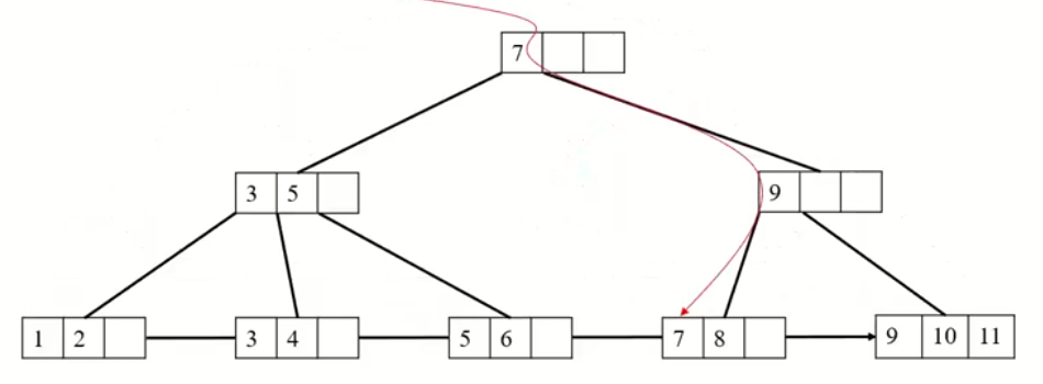 다음 그림은 3-way B+Tree 에서 7 값을 검색하는 과정입니다
