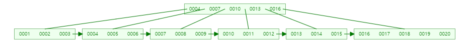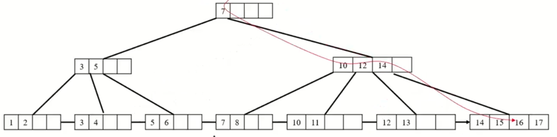 다음 그림은 4-way B+Tree 에서 16값을 검색하는 과정입니다.