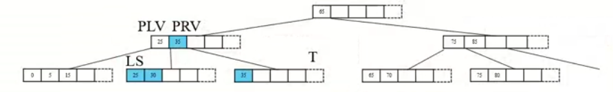 6. LS, PLV, T를 merge 합니다 0, 5, 15가 PRV의 왼쪽 자식으로 되고 T를 P로 변경한 후 MIN_KEY 조건을 위배하는지 확인합니다. P는 25로 key 값이 1개이기 때문에 MIN_KEY 조건을 위배합니다.