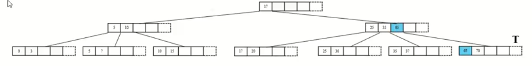 9. 부모를 다시 T(65)로 두고 MIN_KEY 조건을 검사하고 root node는 최소 1개의 키만 가지면 되기 때문에 MIN_KEY 조건을 위배하지 않습니다.