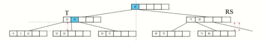8. T는 leaf node가 아니기 때문에 일반적인 b-tree처럼 merge가 발생합니다 부모의 35가 T로 내려오게 되고 부모로 RS의 65가 올라가게 됩니다.