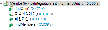 테스트는 계속 실행 가능해야 하지만 회원가입 테스트를 2번 진행하면 중복회원 예외가 발생하면서 테스트에 실패하게 됩니다.