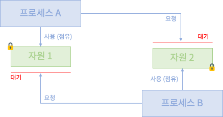 둘 이상의 프로세스들이 자원을 점유한 상태에서 서로 다른 프로세스가 점유하고 자원을 요구하며 무한정 기다리는 현상을 말합니다.