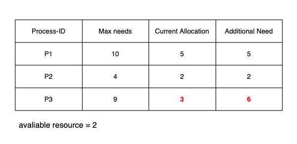 현재 Avaialbie Resource 개수는 12(현재 자원) - 5(P1 사용량)- 2(P2 사용량) - 3(P3 사용량) = 2입니다.