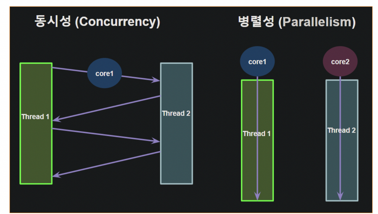 하나의 코어에서 여러 스레드가 실행되는 것을 동시성(Context switching이 발생하고 내부적으로 계속 번갈아가면서 진행) - 빠르게 번갈아가면서 수행하기 때문에 동시에 수행되는 것처럼 보이나 그렇지 않음