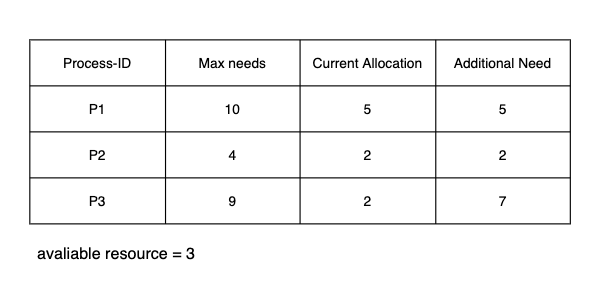 현재 Avaialbie Resource 개수는 12(현재 자원) - 5(P1 사용량)- 2(P2 사용량) - 2(P3 사용량) = 3입니다.