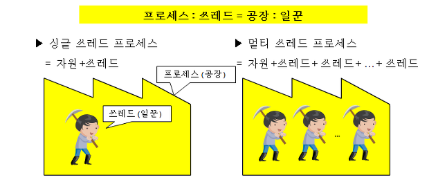 따라서 모든 프로세스에는 최소한 하나 이상의 스레드가 존재하며, 둘 이상의 스레드를 가진 프로세스를 Multi-Thread 프로세스라고 합니다.