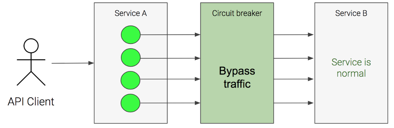Service B로의 모든 호출은 Circuit breaker를 통하게 되고 Service B가 정상적인 상황에서는 트래픽을 문제없이 전달합니다.