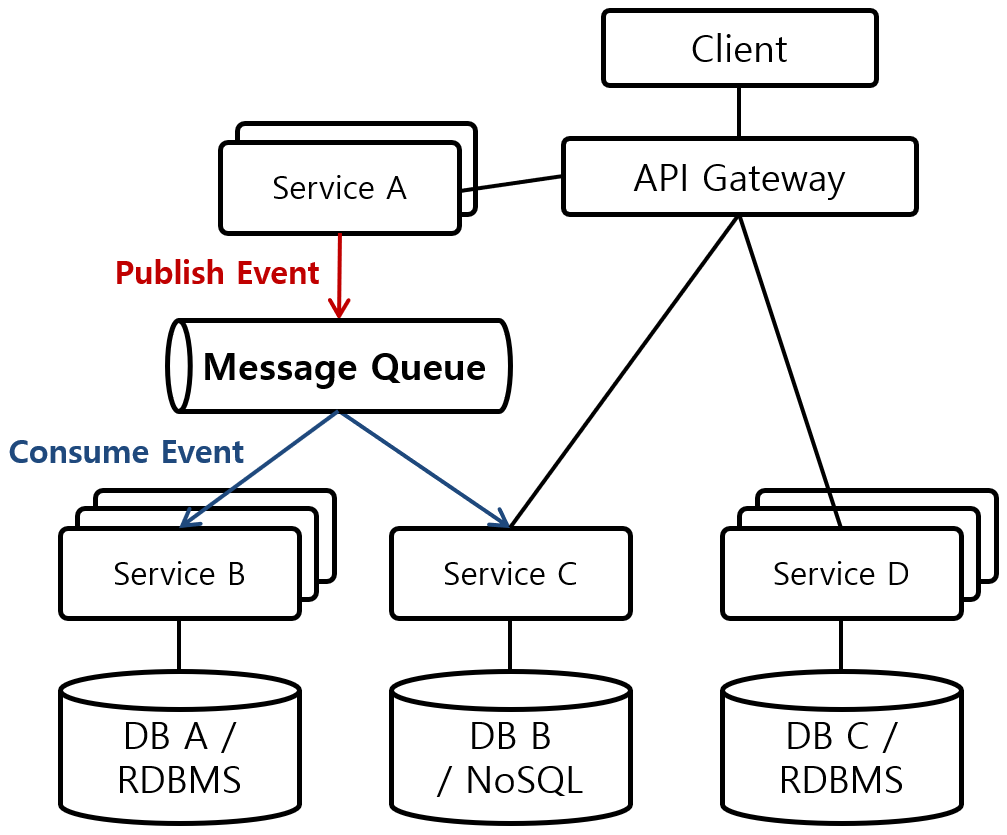 Kafka나 RabbiyMQ와 같은 Message broker(메시지를 전달하는 시스템)을 사용합니다.