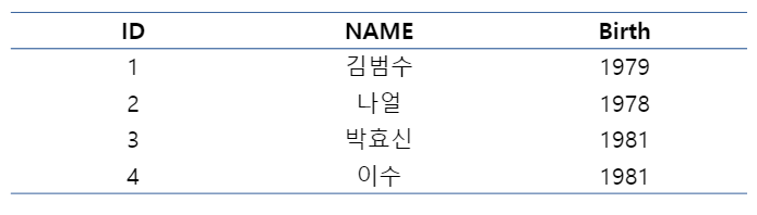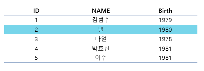 위의 테이블에 만약 Name : 넬, Birth : 1980 데이터를 ID : 2에 추가한다면 테이블의 상태는 다음과 같이 변합니다.